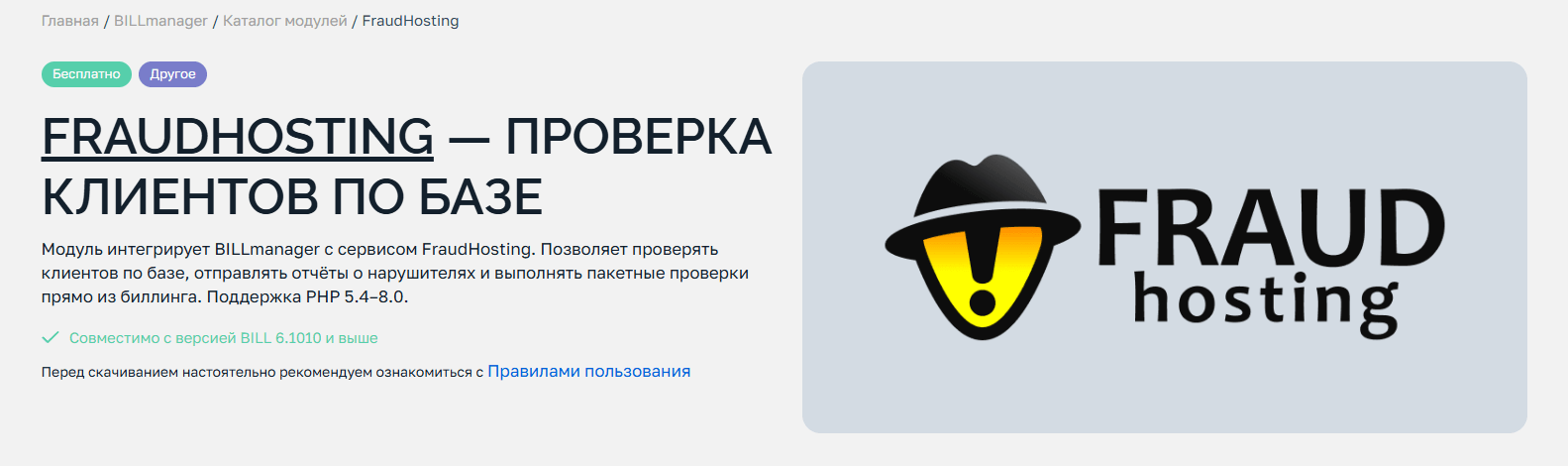 - Модуль интеграции с FraudHosting. Это решение позволяет проводить проверку клиентов по базе сервиса FraudHosting непосредственно из интерфейса BILLmanager. С его помощью можно отправлять отчеты о нарушителях и выполнять пакетные проверки данных, что повышает безопасность и снижает риски хостинг-провайдеров.