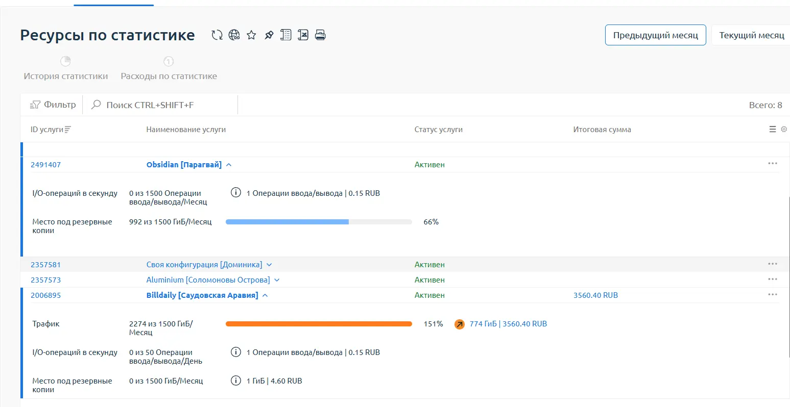 Кроме этого, в личном кабинете в разделе «Ресурсы по статистике» клиенты могут отследить услуги, к которым подключена опция статистики, а также проанализировать использование подключенных сервисов. Услуги попадают в этот раздел при приближении к лимиту или после его превышения. В конце месяца список очищается.